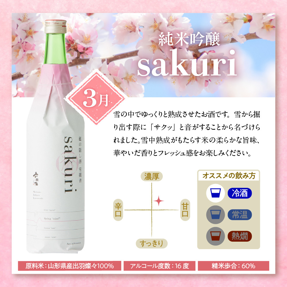 東根市唯一の酒造メーカー「六歌仙」のおいしいお酒です。 蔵の隠し酒は、四季で移り変わるお酒です。六歌仙×東北芸術工科大学「産学連携プロジェクト」で若者の意見をふんだんに取り入れネーミングとパッケージを一新! お酒を絞り出す音と動作に着目し、若者が手に取りたくなるようなデザイン、かつ、四季ごとに移り変わっていくお酒の味わいを表現したデザインになっています。 〇蔵の隠し酒 純米吟醸 【冬(12月):Gyururi(ぎゅるり)】 搾りたてならではのフレッシュな味わいと軽快な味わいが楽しめます。誕生したての味わいと米の旨味、華やいだ香りをお楽しみください。 【春( 3月):Sakuri(さくり)】 雪中にてゆっくりと熟成させました。米の柔らかな旨味、華やいだ香りとフレッシュ感に雪解けの波動がもたらす滑らかな味わいが楽しめます。 【夏( 6月) :Kirari(きらり)】 新酒を6ヶ月間じっくりと氷温貯蔵にて熟成させました。喉越しの良さに、シャープなキレのある爽やかな夏を思わせる香りをお楽しみください。 【秋( 9月):Sururi(するり)】 冬に出来たお酒を火入れし低温で熟成、夏越しさせました。柔らかな香りと芳醇な味わいは、 極上の秋上がりしたお酒です。 ■製造地 山形県東根市 ■提供事業者 発送元:東根市農業協同組合(よってけポポラ) 提供元:株式会社六歌仙 ■注意事項・その他 ※画像はイメージです。 ※受取後、すぐに返礼品の状態をご確認ください。 ※年末年始や中元お歳暮時期等の繁忙時期は、通常よりも発送までにお時間をいただく場合がございます。 ※天候・交通等により発送にお時間をいただく場合がございます。 ※20歳未満の飲酒は法律で禁止されています。