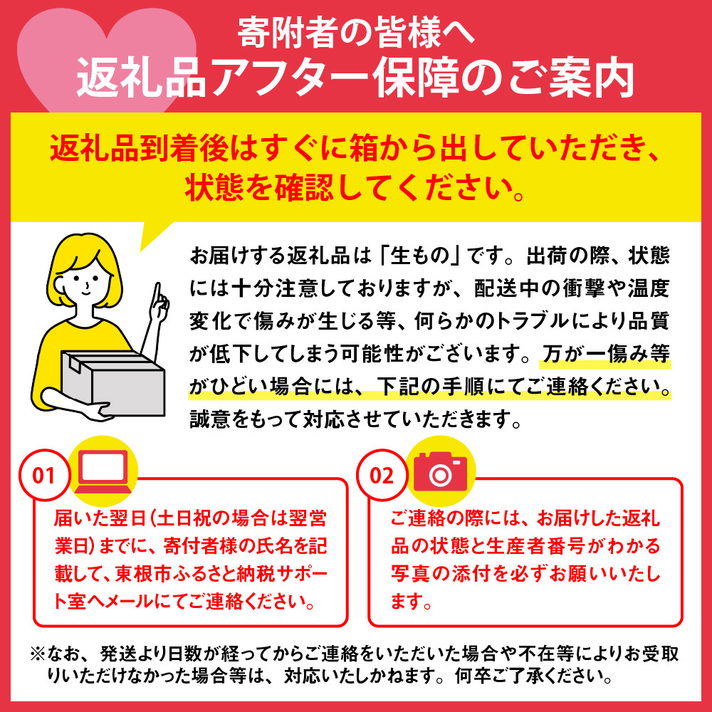 2026年11月上旬~11月下旬 ※発送日の指定はできません。 ※長期不在等の寄附者様事由による返送、劣化については、再送を承ることができませんのでご了承ください。 ※不在票が入っていた場合は、速やかに再配達依頼を行ってください。運送事業者様の保管期間が過ぎて返送されてしまった返礼品の再配達はできかねます。 ※配送業者はヤマト運輸の予定です。 |