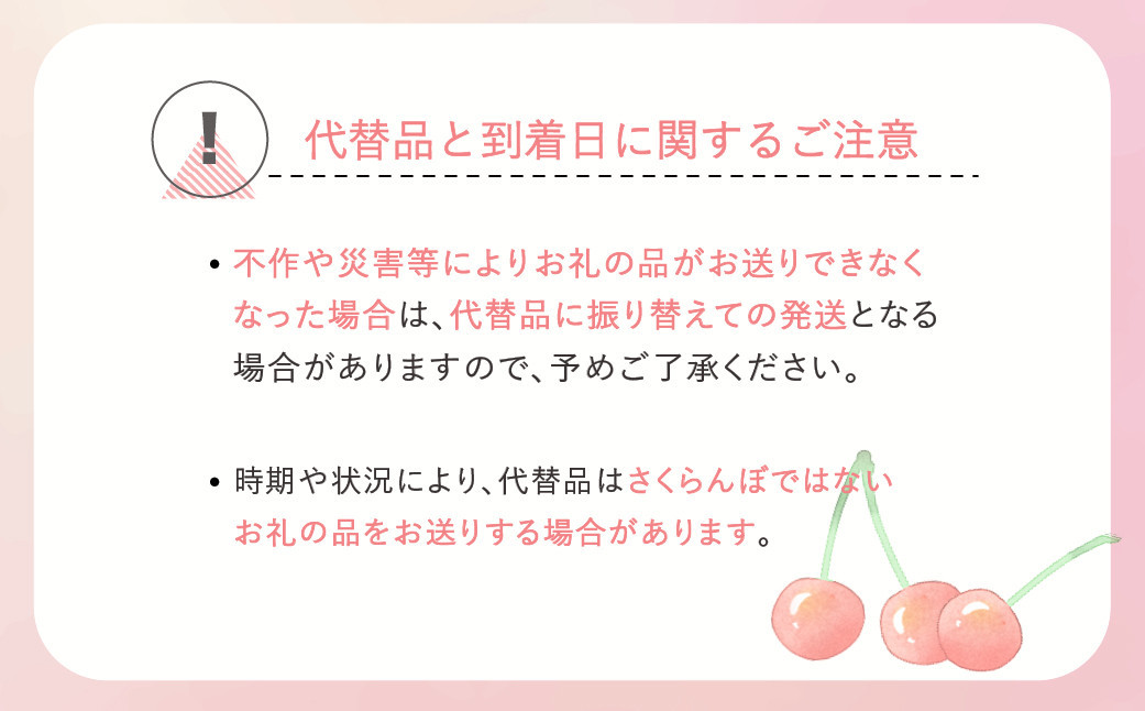 ・時期や状況により、代替品はさくらんぼではないお礼の品をお送りする場合があります。