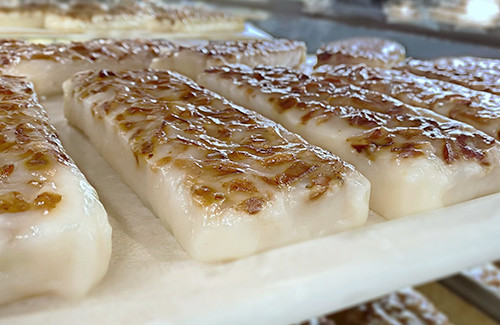 『くぢら餅』とは山形県の最上地域で古くから伝わる郷土菓子です。くぢら餅という名前は、携帯食物として、久しく持ち歩いても良い餅(久持良餅)という意味でつけた説やその形から鯨を連想してつけたという説などがあります。現在では、桃の節句にお雛様にくぢら餅をお供えする習慣があり、家族みんなでくぢら餅をいただきながら春の訪れをお祝いしています。うろこやのくぢら餅のこだわりと人気の秘密は、挽きたての餅米を使用することです。風味豊かで艶のある、他では味わえないうろこやの人気の商品となっております。