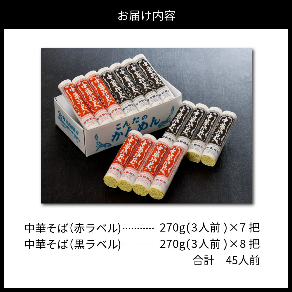 | 容量 | 【全力中華セット(乾麺)45人前】 中華そば(赤ラベル):約270g(3人前)×7把 中華そば ブラックレーベル(黒ラベル):約270g(3人前)×8把 |