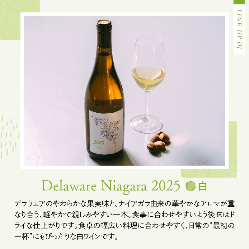 水はけが良く、吹き抜ける風が心地よい山形県河北町沢畑地区で栽培されたぶどうを100%使用(「はじまり農園う~の」さん栽培)。ぶどう栽培、醸造においてなるべく余分なものを使用しない、自然な造りのワインです。 赤はマスカット・ベーリーA、白はデラウェア主体にナイアガラをブレンド。品種個性がはっきり違う2本を、同じ年のヴィンテージで楽しめます。 ■Muscat Bailey A 2025 赤 シリーズ初の赤ワイン『Muscat Bailey A 2025』。 香りはイチゴやプラム、赤いリンゴのような果実味が立ち上がり、 次第に紅茶を思わせるほのかな香ばしさが顔を出します。 口当たりまろやか、甘酸っぱい果実の印象がありつつ、後味はドライ。 ダシのような旨味も柔らかく広がる”薄旨”な仕上がりです。 ■Delaware Niagara 2025 白 デラウェアのやわらかな果実味と、ナイアガラ由来の華やかな アロマが重なり合う、軽やかで親しみやすい一本。 食事に合わせやすいよう後味はドライな仕上がりです。 食卓の幅広い料理に合わせやすく、 日常の“最初の一杯”にもぴったりな白ワインです。 【こだわり】 赤は“薄旨”の旨みとドライな後口、白は華やかな香りと軽快さ。和食・野菜料理・発酵の旨みにも合わせやすい方向性で揃えました。 赤は赤果実+ハーブ感と旨みの余韻、白はアロマティックで明るい果実感。気分や料理で選べるだけでなく、2本並べることで味わいの輪郭がよりクリアになります。 【注意事項】 ※20歳未満の飲酒は法律により禁止されています。20歳未満の方のお申込みはご遠慮ください。 ※瓶内発生ガスが強い可能性もありますので、冷蔵庫できっちり冷やし、静かに開栓してお楽しみください。 ※瓶底に沈殿物(澱など)が生じる場合がございますが、ぶどう由来の自然な成分ですので、品質には問題ございません。