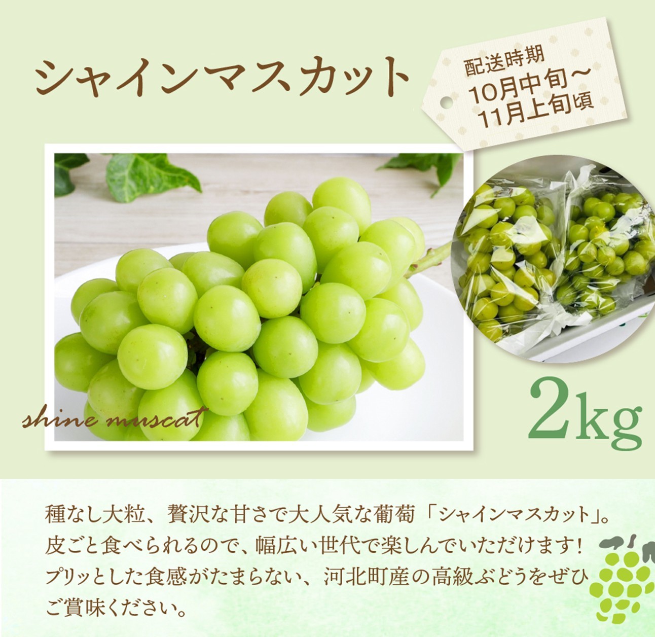 | 容量 | 山形県河北町産 シャインマスカット2kg |
