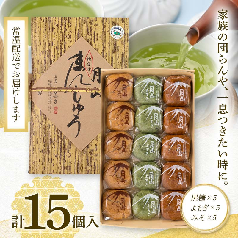 全国菓子大博覧会で数々の賞を受賞!しっとりモチモチ食感の皮が自慢 FYN9-278 【菓子舗わかつき】月山まんじゅう詰合せ (15個) 3種 黒糖 よもぎ みそ 全国菓子大博覧会受賞 山形県 西川町 銘菓