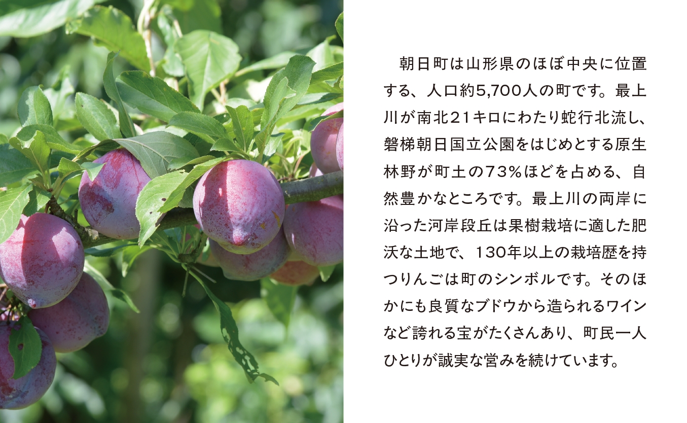 朝日町産果実は標高が高く最上川によって浸食された河岸段丘で多く栽培されているため、寒暖差が特に大きく果樹栽培に適した産地です。