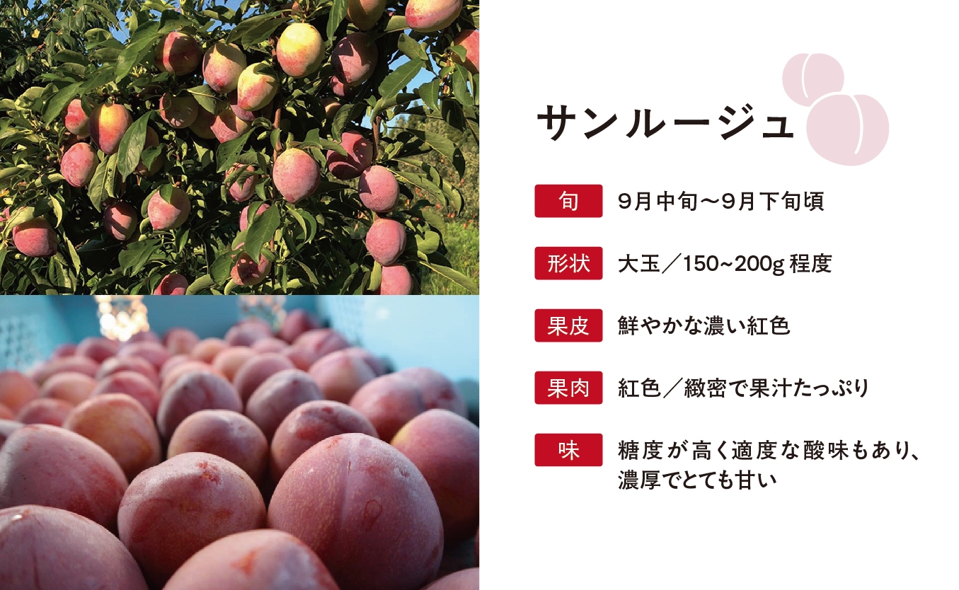 プラム(すもも)の「サンルージュ」は晩生種のため、特に寒暖差が大きい時期に収穫されることから、良質でおいしく仕上がります。