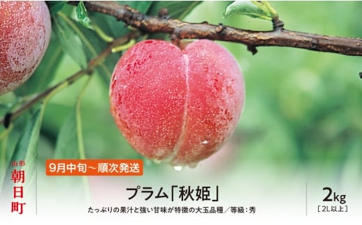朝日町は標高が高く最上川によって浸食された河岸段丘で多く栽培されているため、寒暖差が特に大きく果実の栽培に適している産地です。 プラム(すもも)の秋姫は晩生種のため、特に寒暖差が大きい時期に収穫されることから、良質でおいしく仕上がります。 今回は大玉サイズを化粧詰めしてお届けします。是非この機会にご賞味ください。 ※返礼品のお受取り後すぐに状態をご確認いただき、発送には万全を期しておりますが、万が一ひどい傷み等があった場合は、写真・画像を添付の上お早めにご連絡ください。 尚、お時間が過ぎてからの対応はいたしかねます。 ※天候や収穫状況により、規格が変更になる場合がございます。 ※大変申し訳ありませんが、日持ちのしない農産物のため沖縄県、離島への配送はいたしかねます。