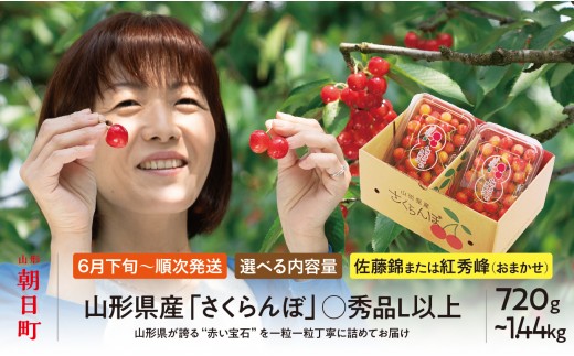 丸秀品: L以上 選べる容量 720g (180g×4)・ 1.44kg (180g×8) ※専用箱入り(デザインは変更する場合があります) ※お届けするさくらんぼは「佐藤錦」又は「紅秀峰」となります。品種をお選びすることはできません。予めご了承下さい。 ※お届け日時指定可能です(6月下旬~7月上旬までの期間) ※発送する約2週間前に、竹城青果(受託業者)よりメールにて、お届け先及びご不在日等の確認が届きますので「お届け希望日時」、もしくは「ご不在予定日」をお伝えください。 ※寄付者様のご不在や住所間違い等による返礼品の劣化の場合、再配達はお断りする場合がございます。 ※クール便(冷蔵)でのお届けになります。 ※さくらんぼは非常に痛みの出やすい果物です。到着後はお早めにお召し上がりください。 ※沖縄及び離島にはお届けできません。 ※返礼品にはふるさと納税のお礼状を同封いたしますので、別送される場合はご注意ください。 【山形連携中枢都市圏における共通返礼品です。関係市町(山形市、寒河江市、村山市、尾花沢市、山辺町、中山町、河北町、西川町、朝日町、大江町、又は大石田町)内で生産された「さくらんぼ」をお送りします。】