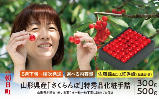 特秀品: 化粧手詰 選べる容量 (L300g・L500g・2L300g・2L500g) ※専用化粧箱入り(デザインは変更する場合があります) ※お届けするさくらんぼは「佐藤錦」又は「紅秀峰」となります。品種をお選びすることはできません。予めご了承下さい。 ※お届け日時指定可能です(6月下旬~7月上旬までの期間) ※発送する約2週間前に、竹城青果(受託業者)よりメールにて、お届け先及びご不在日等の確認が届きますので「お届け希望日時」、もしくは「ご不在予定日」をお伝えください。 ※寄付者様のご不在や住所間違い等による返礼品の劣化の場合、再配達はお断りする場合がございます。 ※クール便(冷蔵)でのお届けになります。 ※さくらんぼは非常に痛みの出やすい果物です。到着後はお早めにお召し上がりください。 ※沖縄及び離島にはお届けできません。 ※返礼品にはふるさと納税のお礼状を同封いたしますので、別送される場合はご注意ください。 【山形連携中枢都市圏における共通返礼品です。関係市町(山形市、寒河江市、村山市、尾花沢市、山辺町、中山町、河北町、西川町、朝日町、大江町、又は大石田町)内で生産された「さくらんぼ」をお送りします。】