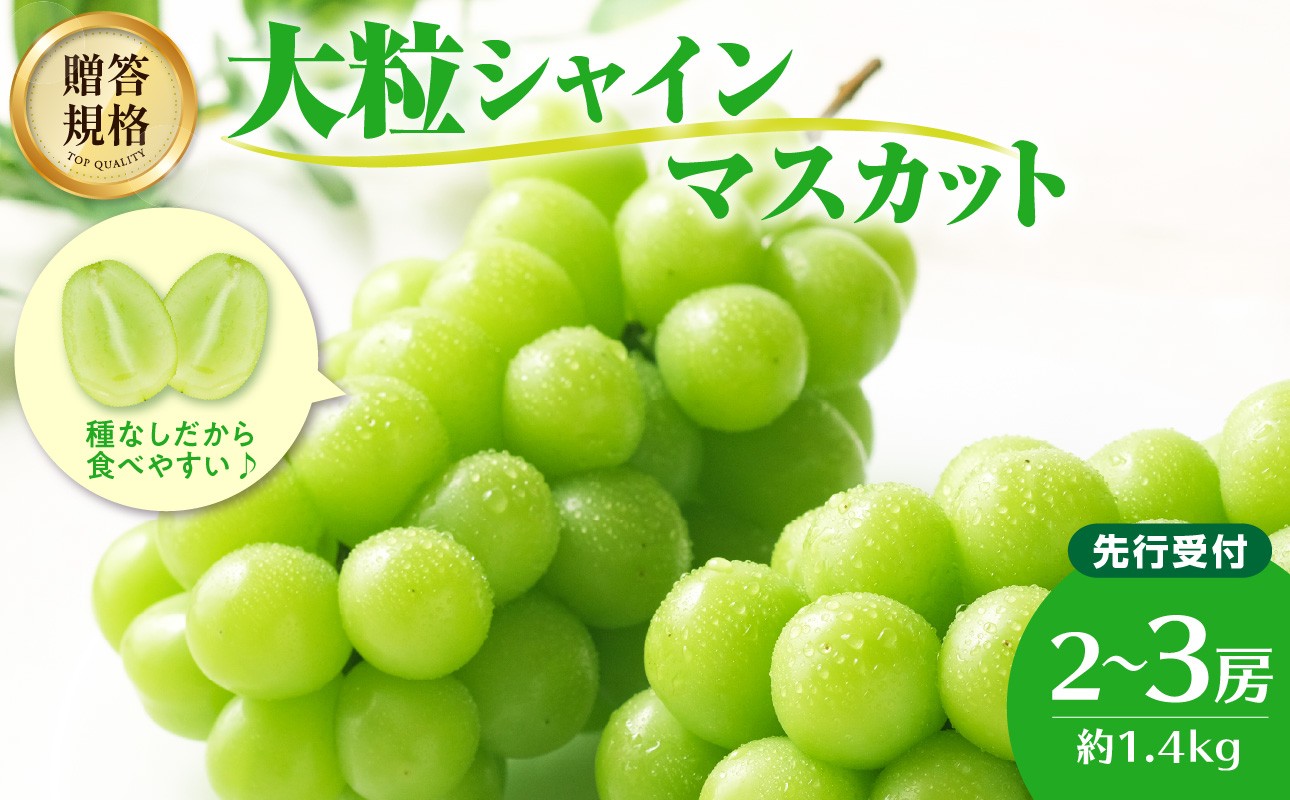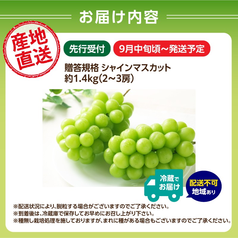 大江町の恵み。皮ごと食べられる、もぎたてのシャインマスカットをお届け! 《先行受付》贈答規格シャインマスカット 約1.4kg(2~3房)【2026年9月中旬頃~順次発送予定】【山形ぶどう・大江町産・小林葡萄園】 【024-003】