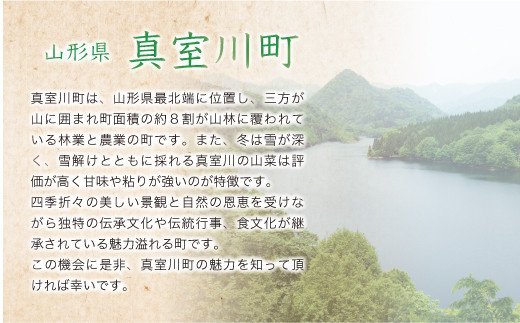 近年急激に進む人口減少の原因のひとつともなっている「雪」は、一方で恵みの源でもあります。雪解けとともに採れる真室川の山菜は県内においても評価が高く、甘みや粘りの強いのが特徴です。その他1年かけて雪の多い冬を乗り切る準備をしてきた地域であり、保存食や郷土料理をはじめとした暮らしの文化が醸成され、四季と農林業と切っても切り離せない数々の神事や風習を形成してきました。冬期間に内職仕事として編まれてきた藁細工やつる細工は、今もこの地に息づいています。
