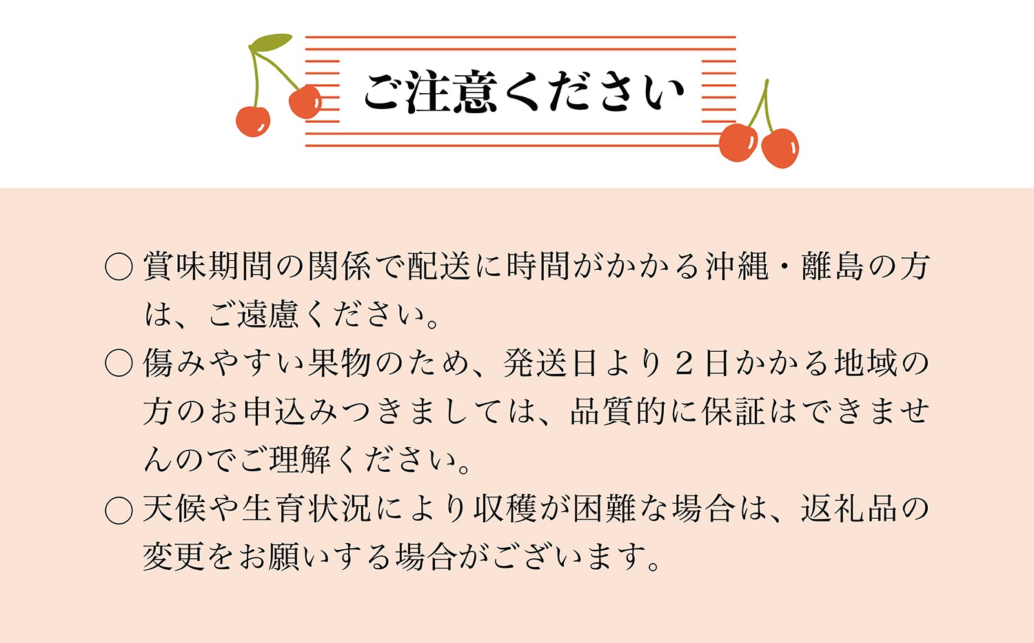 この返礼品は、出荷不適格の【訳あり】となりますので予めご了承ください。収穫の際に軸が取れてしまったり、着色不良となってしまった【訳あり】のさくらんぼとなりますが、通常のさくらんぼと同様に、柔らかい果肉と口いっぱいに広がるさくらんぼの甘酸っぱさを味わえます。