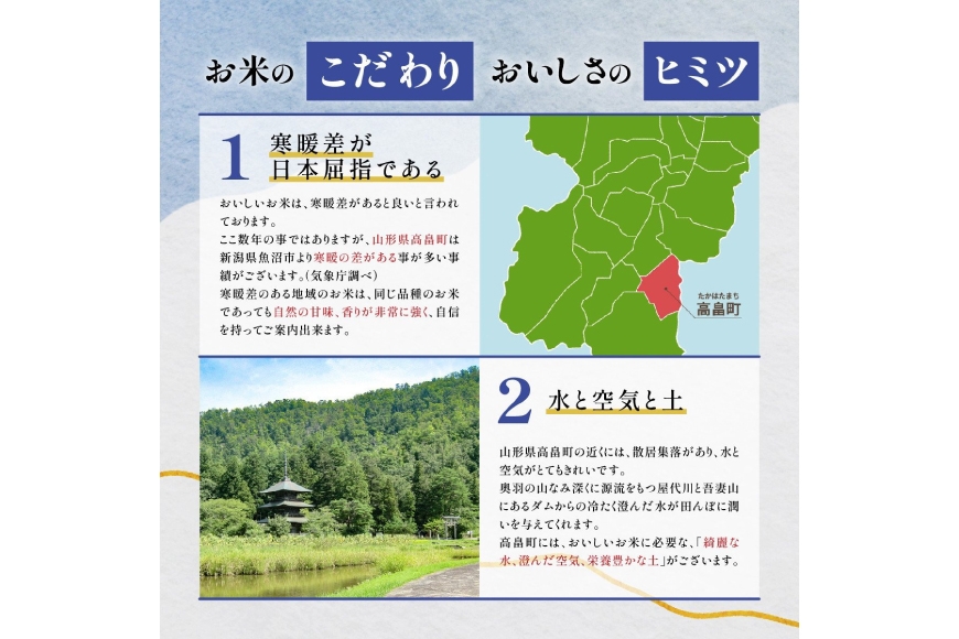高畠町は、江戸時代には幕府直轄の天領になるほど昔から米どころとして有名でした。『金子農園』の圃場がある屋代地区は、粘土質で栄養豊富な土壌、水窪ダムからの澄んだ水、きれいな空気が揃った自然豊かな地区。昼夜の寒暖差も大きく、美味しいお米が育つ条件が揃っています。