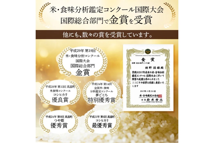 猪野さんは、2007年に開催された第19回 米・食味分析鑑定コンクール国際大会 国際総合部門で金賞を受賞。他にも、数々の賞を受賞しています。