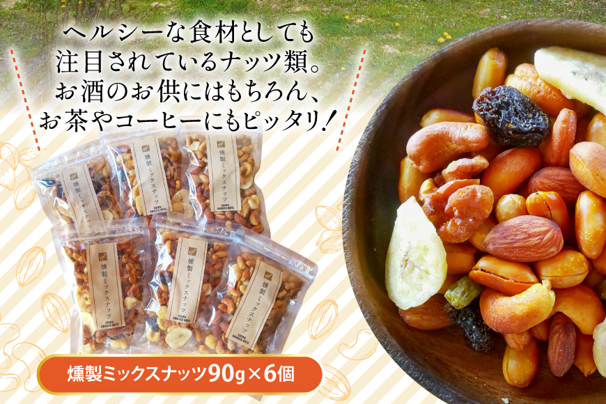 しっかりとした燻製香!やみつきになるミックスナッツ 燻製 ミックス ナッツ 90g 6袋 [伊澤商店 山形県 高畠町 tk06bcz260002] ナッツ ピーナッツ 小分け 個包装 スモーク 手作り くるみ アーモンド カシューナッツ レーズン バナナチップ おつまみ お菓子 おやつ