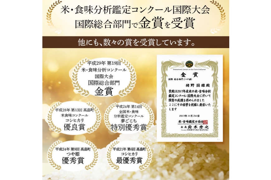 猪野さんは、2017年に開催された第19回 米・食味分析鑑定コンクール国際大会 国際総合部門で金賞を受賞。他にも、数々の賞を受賞しています。