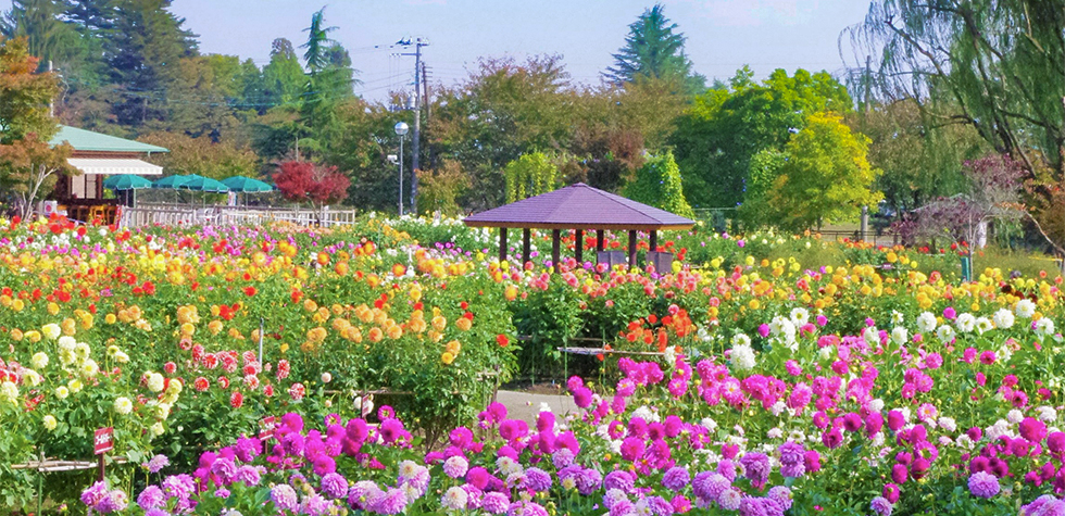 『川西ダリヤ園』では、650品種100,000本のダリアを咲かせ、毎年8月はじめから11月上旬の降霜の時期まで開園しています。メキシコ原産のダリアは、ふるさとメキシコの太陽の輝きのように咲き誇り、多くの来園者で賑わっています。