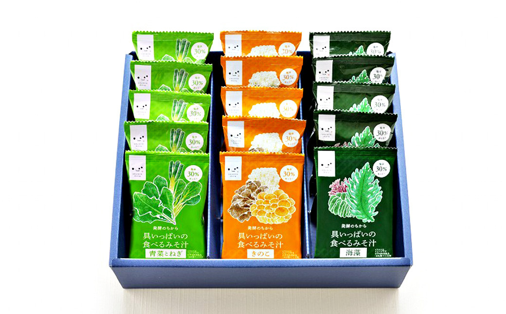 国産ほうれん草、国産小松菜、国産ねぎがふわりと膨らみます。厳選した米みそ、豆みそを三種ブレンドし、複数のだし原料を合わせることで、減塩を感じさせない満足感のある味に仕上げました。