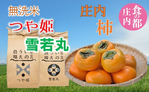 期間限定!《無洗米》つや姫&雪若丸 各2kgと庄内柿約2kgをセットでお届け! 「米どころ庄内」より山形県オリジナル品種の「つや姫」と「雪若丸」を手間いらずの【おいしい無洗米】にしてお届けいたします。 有機肥料を使った土作りでこだわりをもって栽培した令和4年産のお米です。 また、平核無柿(ひらたねなしかき)の元祖と云われている庄内柿。明治時代から150年以上引き継いできた庄内柿を大切に育てております。 栽培地としても恵まれており、出羽三山から運ばれるミネラル豊富な土壌と水、そして昼夜の大きい寒暖差の中で育った柿は、甘くトロっとした食感が楽しめます。 【注意事項】 ※発送には十分に配慮しておりますが、運搬中に傷や潰れが発生する可能性があります。お気づきの点がありましたら、画像・写真を貼付し三川町ふるさと応援寄附金までお問合せをお願いいたします。 ※天候不順や生育不良等により配送が困難となった場合は、代替品等に振り替えてのご対応となる場合がございます。予めご了承ください。 ※発送後にお届け先を変更した場合、転送料が発生します。転送料は着払いになるため寄附者様(転送先)負担となりますので、予めご了承ください。 ※誠に申し訳ございませんが、沖縄および離島への配送はお受けできません。 <食の都庄内とは?> 庄内地域は、四方を山と海に囲まれ、その地形と気候が地域の土地や海に恵みを与えています。このため、庄内は四季を通しておいしい食材の宝庫であり、豊かな食文化が育まれてきました。 まさに食の理想郷、「食の都庄内」の魅力を多くの皆様から実感していただき、内外に発信していくことで、地域の農林水産業はもちろん、食に携わる全ての人たちが元気になることを目指して、山形県と庄内2市3町(鶴岡市、酒田市、遊佐町、庄内町、三川町)が一緒に取り組んでいます。 【返礼品発送のお知らせメールについて】 こちらの返礼品は、ヤマト運輸でのお届けとなります。 配送前の事前連絡は行っておりませんが、返礼品の出荷が完了しましたら《出荷通知メール》が自動送信されます。 申し込みの際にご登録いただいたメールアドレスに自動送信されます。