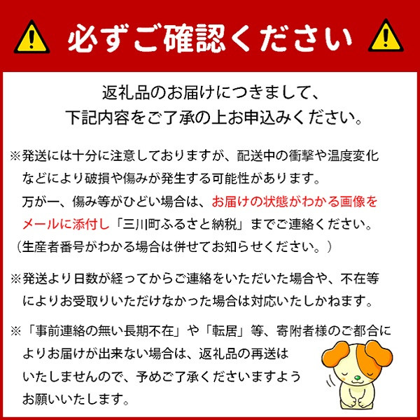 【金曜日発送】 令和8年1月中旬頃より順次配送 ※誠に申し訳ございませんが、沖縄および離島への配送はお受けできません。 【返礼品発送のお知らせメールについて】 こちらの返礼品は、ヤマト運輸でのお届けとなります。 配送前の事前連絡は行っておりませんが、返礼品の出荷が完了しましたら《出荷通知メール》が自動送信されます。 申し込みの際にご登録いただいたメールアドレスに自動送信されます。 |