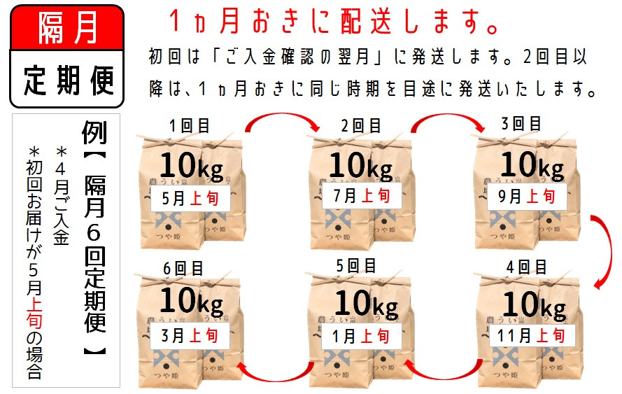 【隔月】1ヵ月おきにお届けします。初回お届けはご入金確認の翌月です。