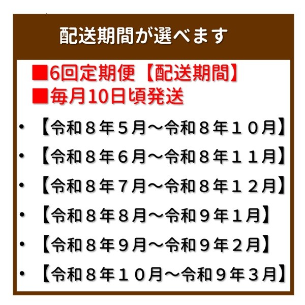 ※毎月10日頃発送 ※誠に申し訳ございませんが、沖縄および離島への配送はお受けできません。 ■配送月 プルダウンよりお選びください。 ・【令和8年5月~令和8年10月】 ・【令和8年6月~令和8年11月】 ・【令和8年7月~令和8年12月】 ・【令和8年8月~令和9年1月】 ・【令和8年9月~令和9年2月】 ・【令和8年10月~令和9年3月】 ※1回の申込につき配送先の指定は1か所 ≪返礼品発送のお知らせメールについて≫ こちらの返礼品の発送は、ゆうパックでのお届けとなります。 事業者が返礼品を発送すると、郵便局から発送した旨のお知らせメールが、申し込みの際にご登録いただいたメールアドレスに自動配信されます。 返礼品の送付先を別途ご指定の場合は、お届け先様のお名前でお知らせメールが配信されますのでご承知おきください。 |