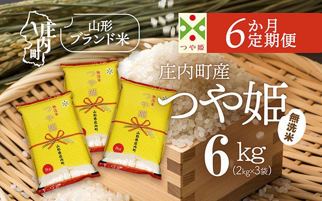 6か月間毎月下旬に庄内産つや姫無洗米2kg×3袋をお届けします。