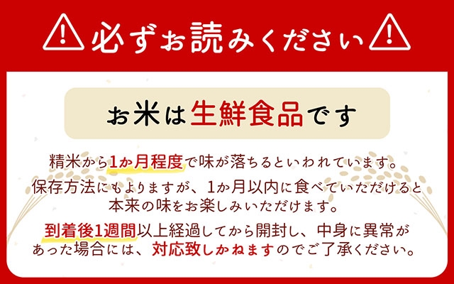 | 消費期限 | 精米から1か月程度(高温多湿の場所を絶対に避け、冷蔵庫の野菜室などの冷暗所に保存してください) |