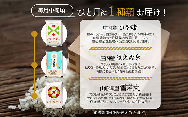 「庄内産はえぬき」「庄内産つや姫」「山形県産雪若丸」各5kg×1袋を3か月間の毎月中旬にお届けします。