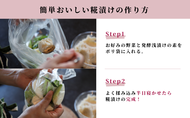 カットした野菜に揉み込んで半日置くだけで、誰でも手軽に野菜のうまみが引き立ったお漬物が作れます。