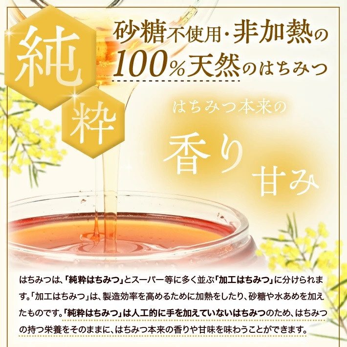 栄養価を損なわない、非加熱の生はちみつです。非加熱のはちみつは、ビタミン・ミネラル・アミノ酸・酵素など、さまざまな栄養素を豊富に含んでいます。