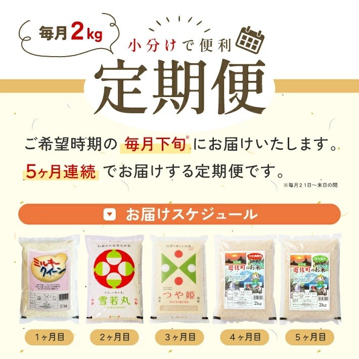 ≪5ヶ月定期便≫ おすすめ5銘柄食べ比べ ミルキークイーン 雪若丸 つや姫 ひとめぼれ はえぬき 各2kg×5ヶ月連続 計10kg 山形県庄内産 山形県遊佐産 ご希望期間の毎月下旬頃お届け 米 お米 精米 白米 ごはん ご飯 連続 ブランド米 小分け 少人数 お試し
