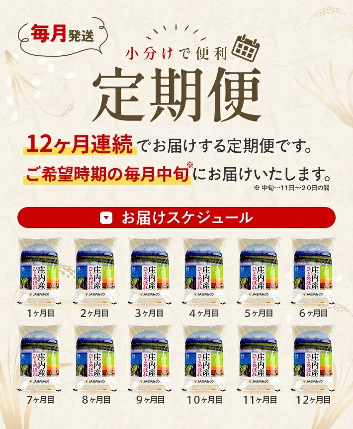 ※12ヶ月連続でひとめぼれ5kg×1袋を毎月中旬(11日~20日)にお届けいたします。