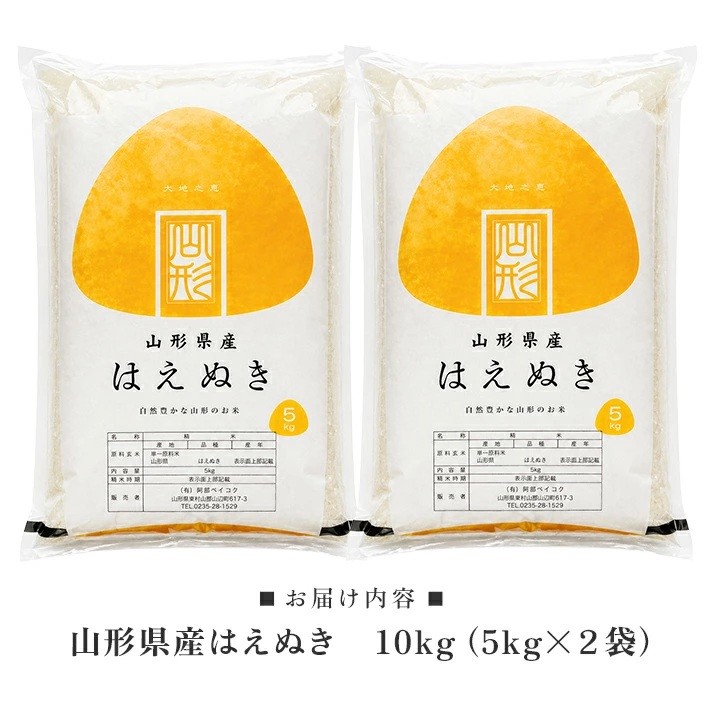 | 容量 | 名称:精米 産地:山形県庄内産 産年:令和7年産 使用割合:単一原料米 内容量:5kg×2袋 計10kg 精米時期:別途商品下部に記載 |