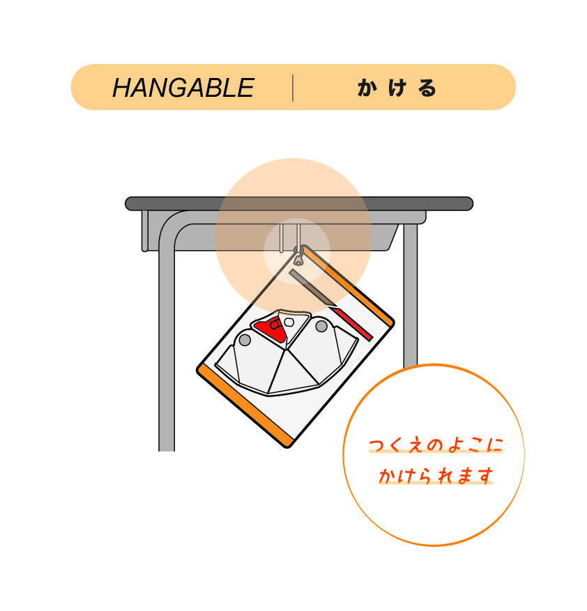収納袋付なので、玄関やロッカー、机の横などにフックでぶら下げることも可能です。