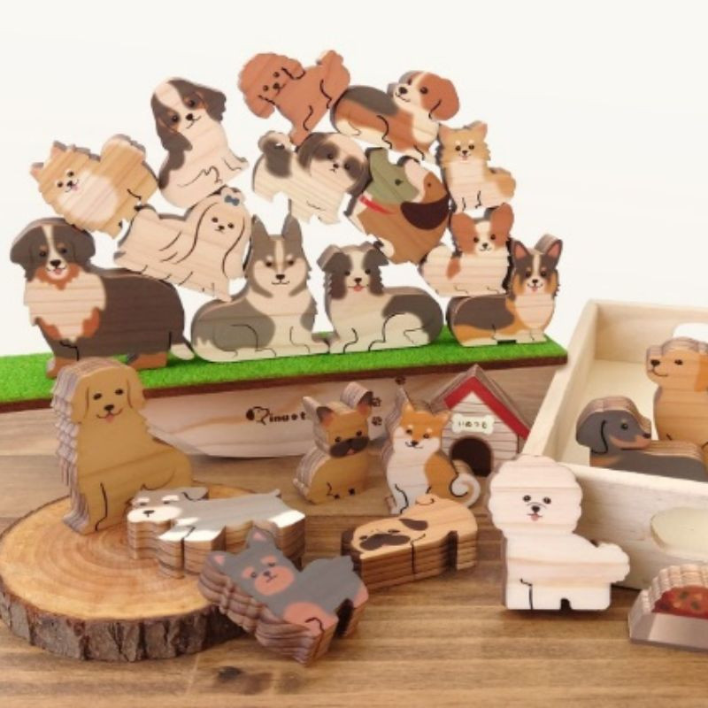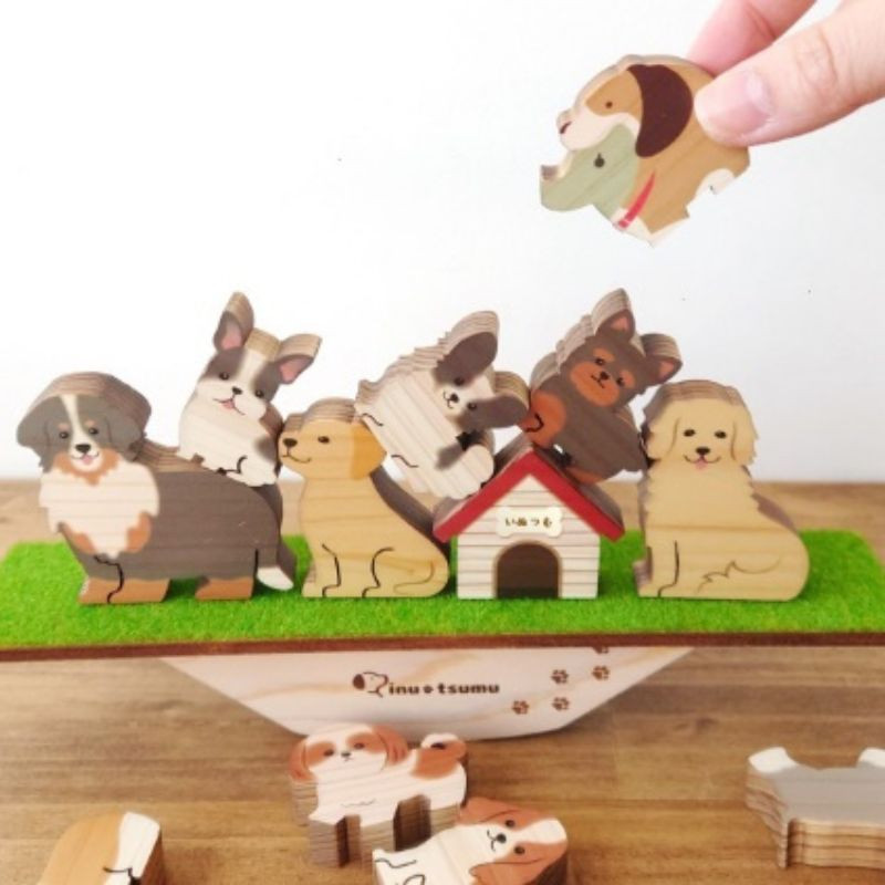 いぬつむは、ゆらゆら揺れる土台の上に全24種類のコマを落とさないようにつんでいくゲームです。