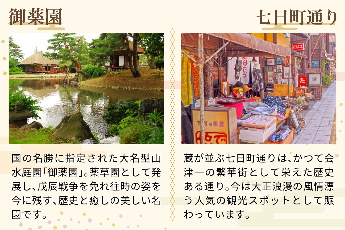 鶴ケ城や飯盛山に代表される歴史と伝統に育まれた名所・旧跡が数多くあり、藩政時代には旧会津藩23万石の城下町として栄え、会津地域の中核都市として発展してまいりました。