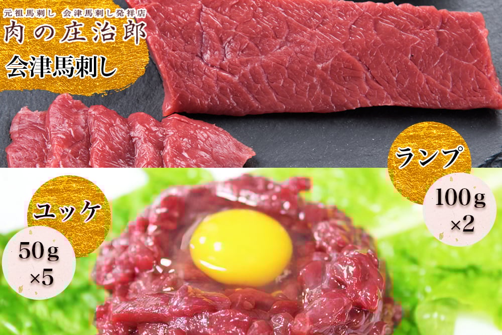 [日本三大馬刺し 会津] 会津馬刺しランプ(100g×2) 会津馬刺しユッケ(50g×5)|会津 馬刺し 馬肉 赤身 福島 グルメ ユッケ 馬 肉刺し 馬刺身 タレ付 本場 ギフト 贈答用 冷凍 [0554]