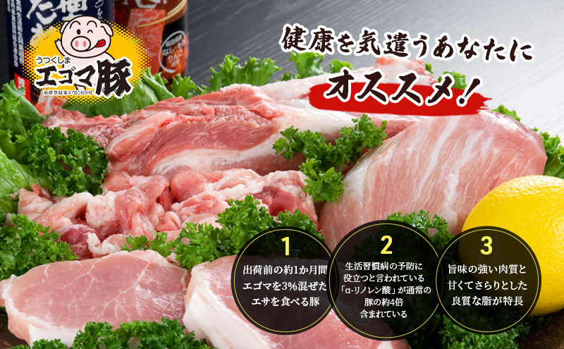 「うつくしまエゴマ豚」とは福島の系統豚「フクシマL」をもとにした三元雑豚に出荷前の1ヶ月間エゴマの実3%を混ぜた餌を与え飼育したブランド豚です。「うつくしまエゴマ豚」にはリノレン酸が通常の豚肉の約4倍、サンマの2倍含まれ、理想的な必須脂肪酸の摂取バランスといわれる<リノール酸:リノレン酸=4:1>にも近く健康を気づかう方にお勧めしたい豚肉です。