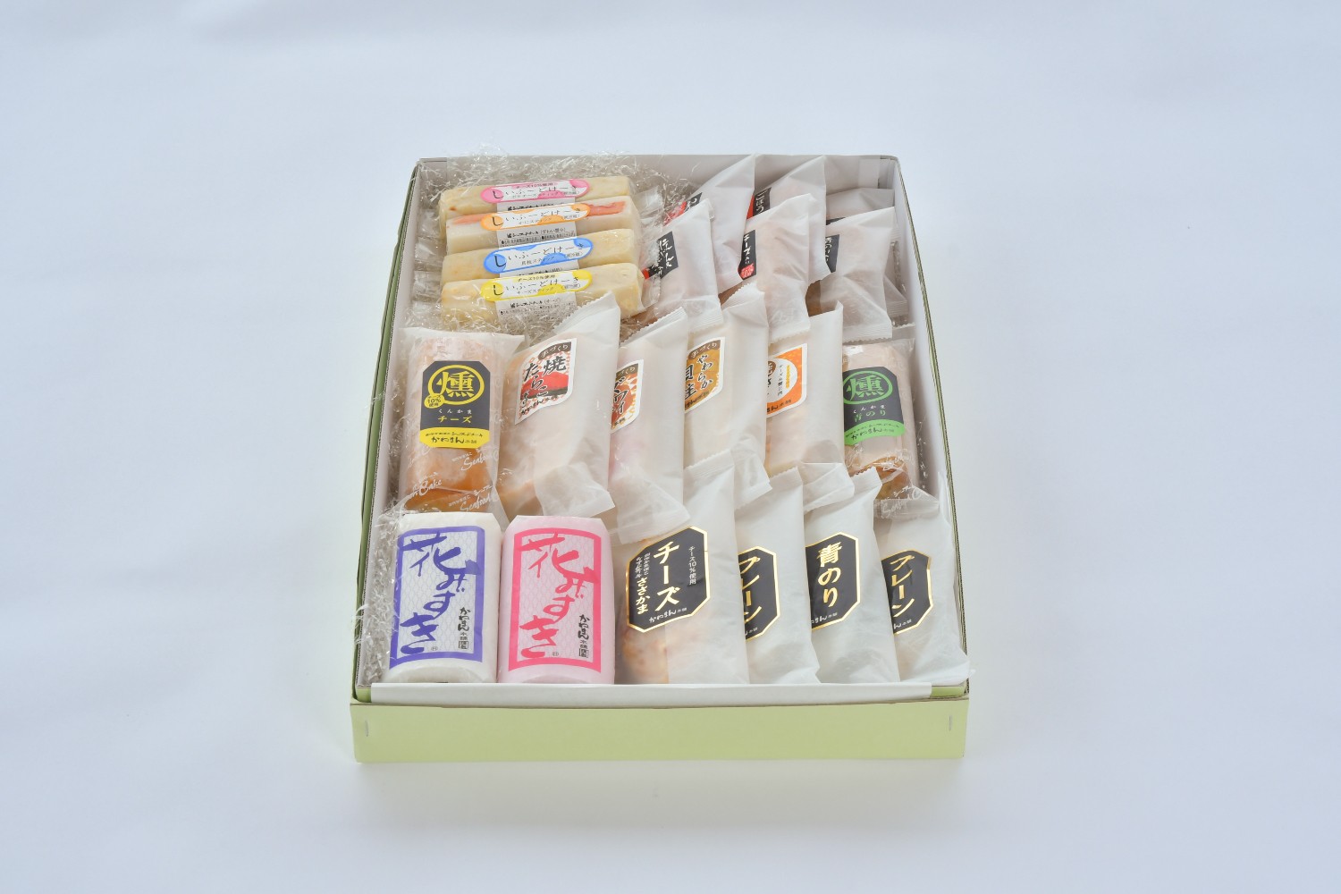 定番の紅白かまぼこに加え、「ズワイ蟹」「鮭&蟹」などのトッピング系、凝縮された旨味と燻香を楽しめる「燻かま」、手軽に楽しめるスティック系、イワシ・ゴボウなどの「シーフード揚」、チーズ・ジャガイモ入りの「ポテ&チーズ」など、自慢の「シーフードケーキ」を網羅した、大ボリュームの豪華セットです。 ■提供:(株)かねまん本舗