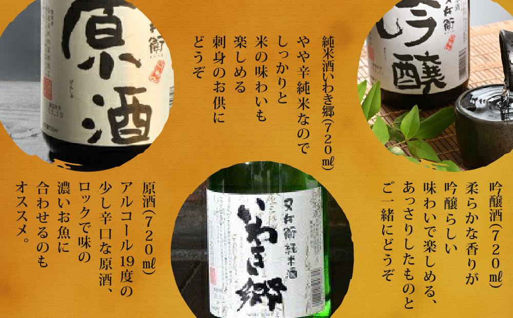 | 容量 | ●又兵衛吟醸酒(720ml) 1本 ●又兵衛純米酒いわき郷(720ml) 1本 ●又兵衛原酒(720ml) 1本 |