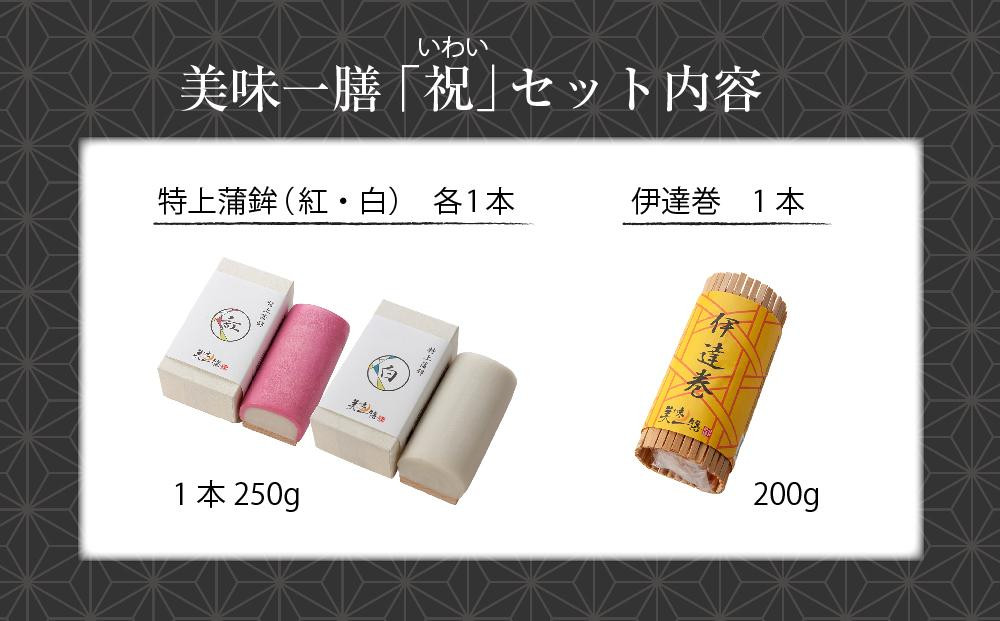 吟味した上質なすり身を使った「特上蒲鉾」白・紅一本ずつと、会津地鶏の卵を鶏卵中28%配合した「伊達巻」を詰めたシンプルなセットです。