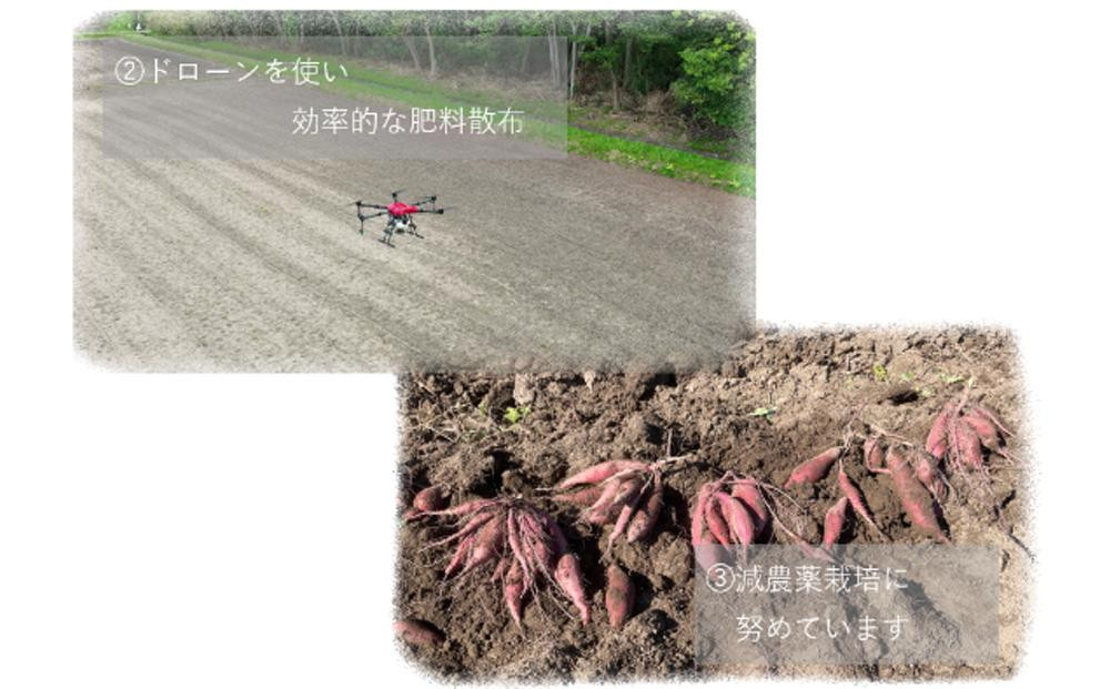 福島県いわき市下神谷地区は、地元では現在ネギの産地で有名です。しかし古い歴史を調べると大昔(江戸時代末期)はなんとお芋の産地だったようです。付近を流れる夏井川河川敷の為、水はけのよい土壌なんです。この豊かな土地で育てたさつまいもを収穫後、温度と湿度を一定に保った貯蔵施設で、1ヵ月から1ヵ月半熟成させることで、おいしさを引き出しています。昨年サツマイモを栽培してみたところ糖度の高い美味しいサツマイモが出来ました。今年は2年目の圃場でこだわって育てたサツマイモを是非ご賞味ください。