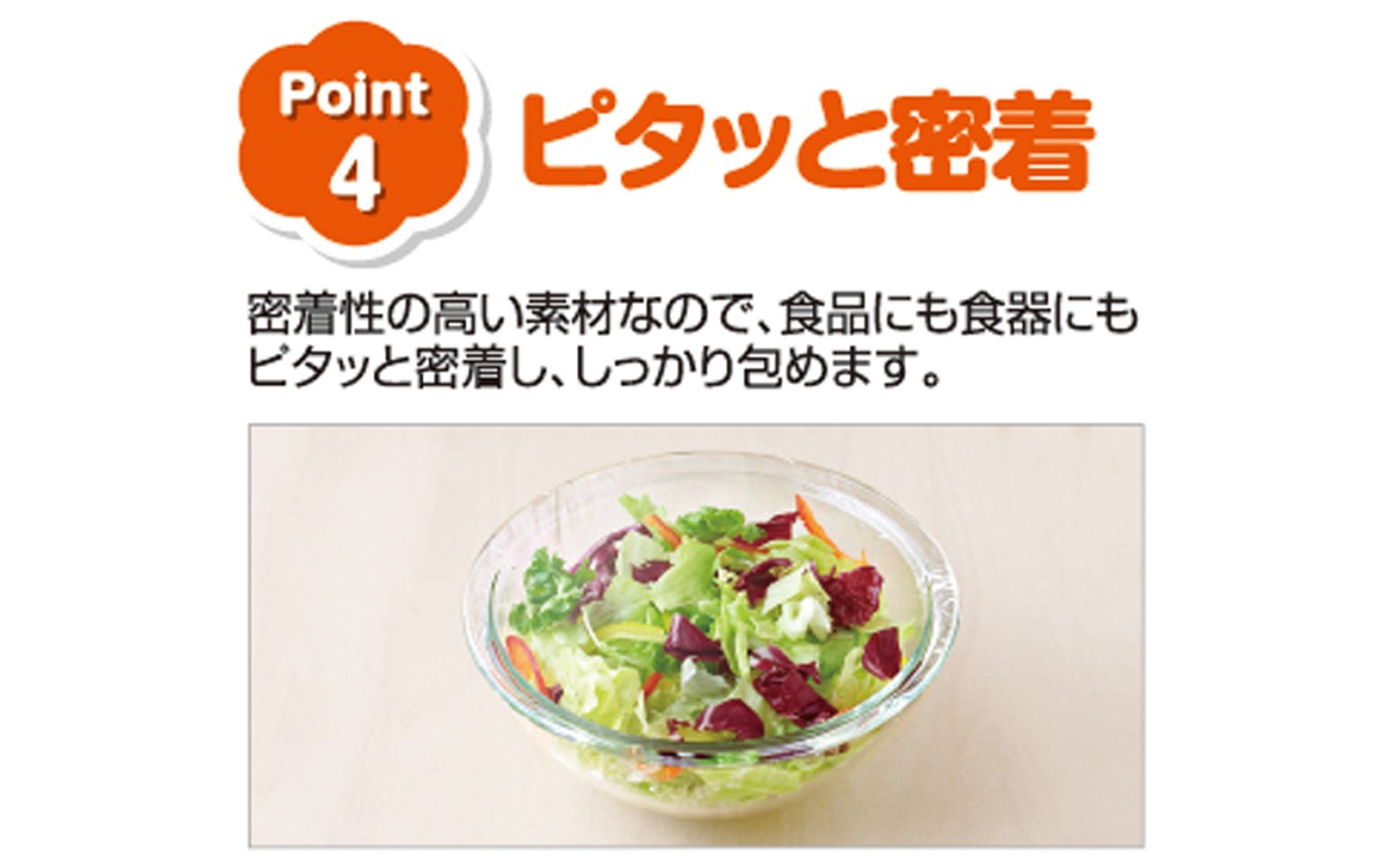 NEWクレラップはポリ塩化ビニリデン製だから、水蒸気や酸素を通しにくく、ラップした食品のみずみずしさや鮮度を保ち、においうつりも抑えます。