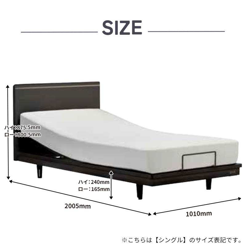| 容量 | 【ベッドフレーム】ポメロ01F RX(電動リクライニング) シングル 1台 【マットレス】電動ベッド専用マットレス(RX-STD-EX)シングル 1枚 【薄型電動ベッド】電動ユニット単体(TRG31N)1台 フレームカラー:ホワイト(WH)/ダーク(DA) 保証期間:フレーム 1年/マットレス 2年 フレームサイズ:幅 1010×長さ2005×高さ(800.5/875.5)高さ(165/240)mm マットレス:幅970×長さ1950×高さ210mm 【フレーム材質】 主板:化粧板、床板:スノコ床板 【マットレス仕様】 スプリング:高密度連続スプリング ニット生地、防ダニ・防菌防臭加工 |