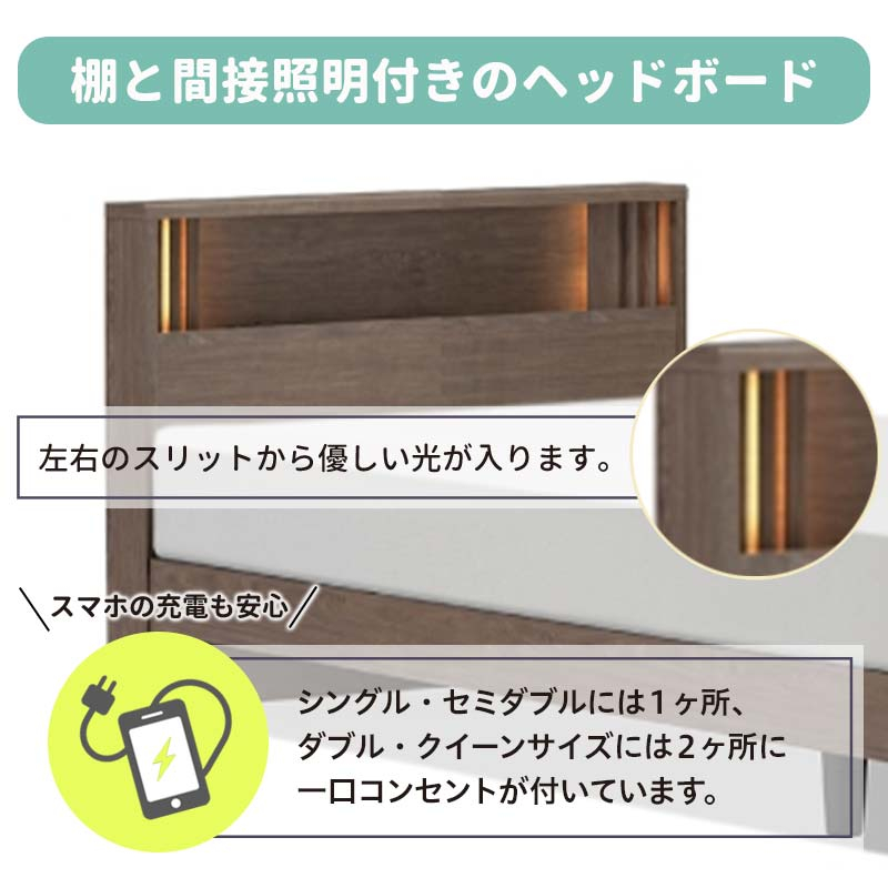 ・左右のスリットからもれる光が様々な表情を見せるキャビネットタイプのヘッドボード。※シングル/セミダブルは向かって左に1口コンセント付き、ダブル/クイーンサイズは左右に1口コンセント付き。レッグの長さが2段階に調節が可能です。