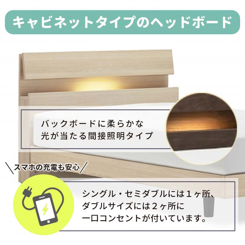 ・小物を立てかけて置くこともできるスマートなキャビネットタイプのヘッドボード。※シングル/セミダブルは向かって左に1口コンセント付き、ダブル/クイーンサイズは左右に1口コンセント付き。引き出しは大容量でフルオープン仕様。奥まで無駄なく使えます。
