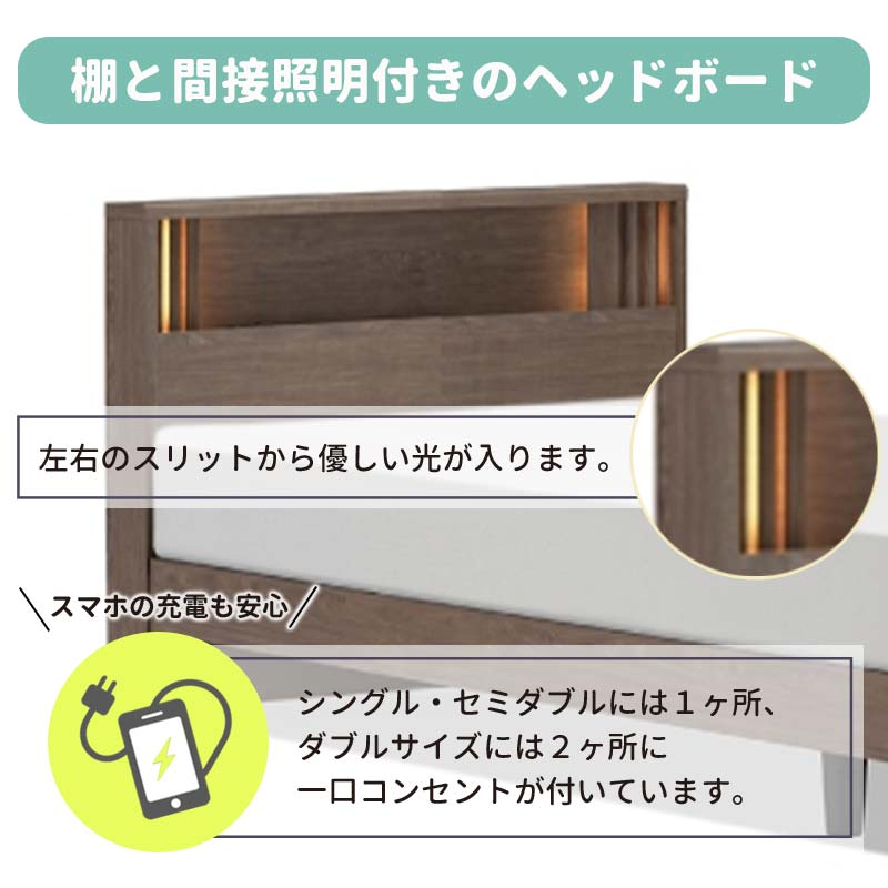 ・左右のスリットからもれる光が様々な表情を見せるキャビネットタイプのヘッドボード。※シングル/セミダブルは向かって左に1口コンセント付き、ダブルサイズは左右に1口コンセント付き。縦跳ね上げ収納は大容量で、長いものや大型のものもたっぷり収納できます。