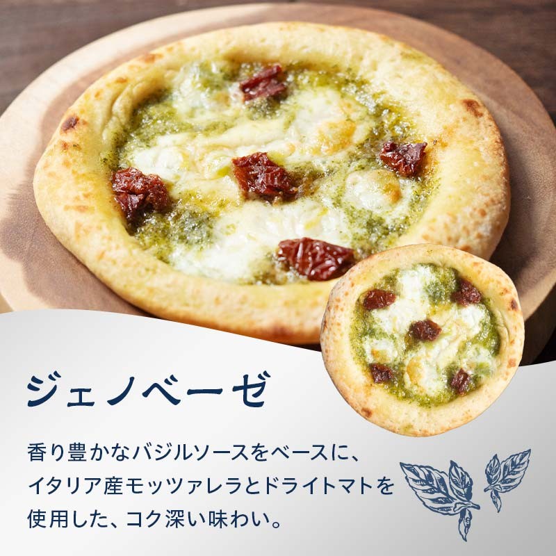 | 容量 | マルゲリータ 6 インチ(約 105g) 1 枚 クワトロフォルマッジ 6 インチ(約 100g) 1 枚 本格ベーコンとアスパラガス 6 インチ(約 110g) 1 枚 ジェノベーゼ 6 インチ(約 95g) 1 枚 サルシッチャ 6 インチ(約 110g) 1 枚 ※6 インチは直径 約 15 cmです。 |