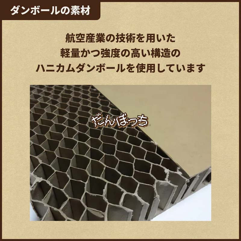 だんぼっちで採用している特殊材質「ハニカム段ボール」は、プラスチックなどの一般的な材質を超える性能と低コストが特徴。